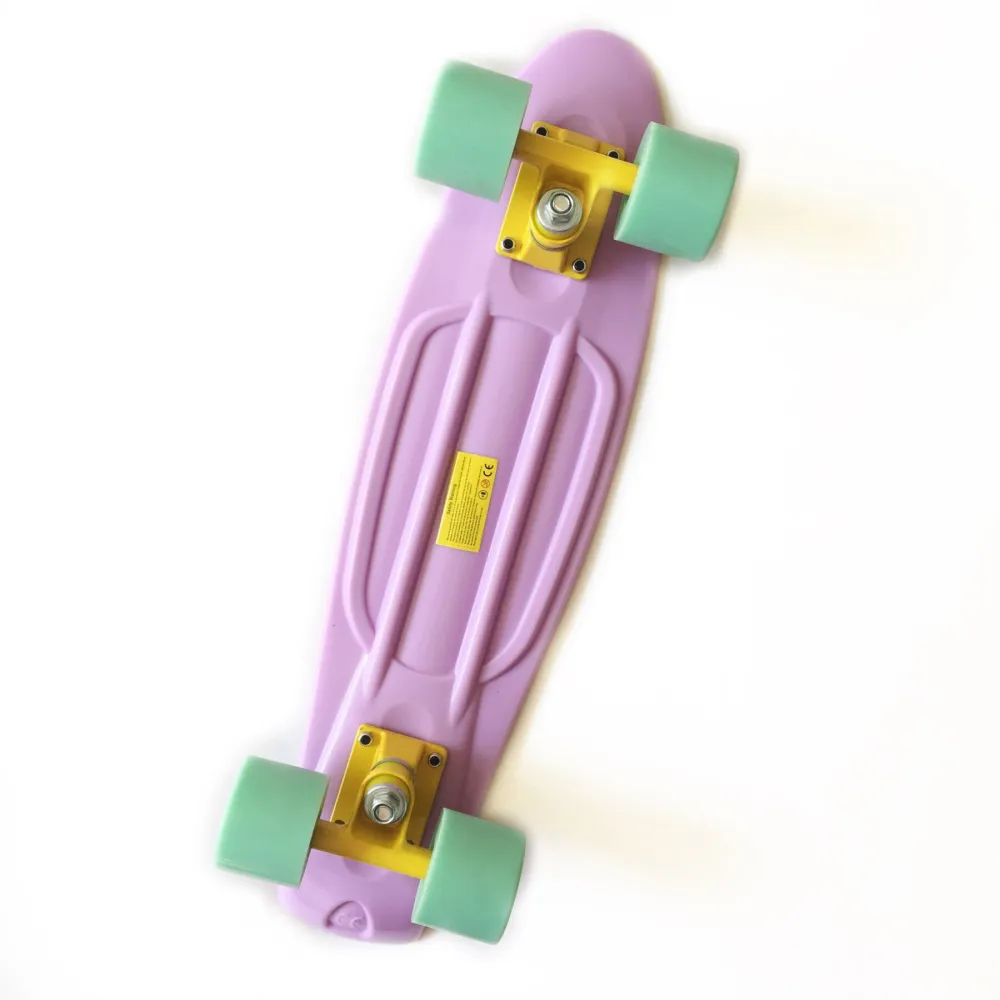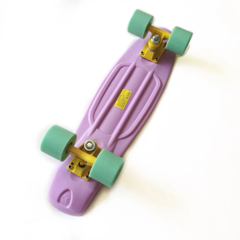 Прокатитесь на лиловом 54 см пенни борде с ветерком. Красивая расцветка модели понравится любителям пастельных тонов, а также тем кому нравятся простые, но лаконичные дизайны.  После получения распакуйте доску и сразу двигайтесь на улицы города или в ближайший парк или скейтпарк. Конструкция пенни борда надежная, легкая и прочная. Качественные материалы скейтборда дают возможность использовать доску на долгое время. Благодаря сбалансировано построенным деталям этого скейтборда, можно передвигаться по городу смело, легко и быстро! Идеальная для передвижения по городу! А засчет мягких широких колес все дороги, даже разбитые покажутся ровными.