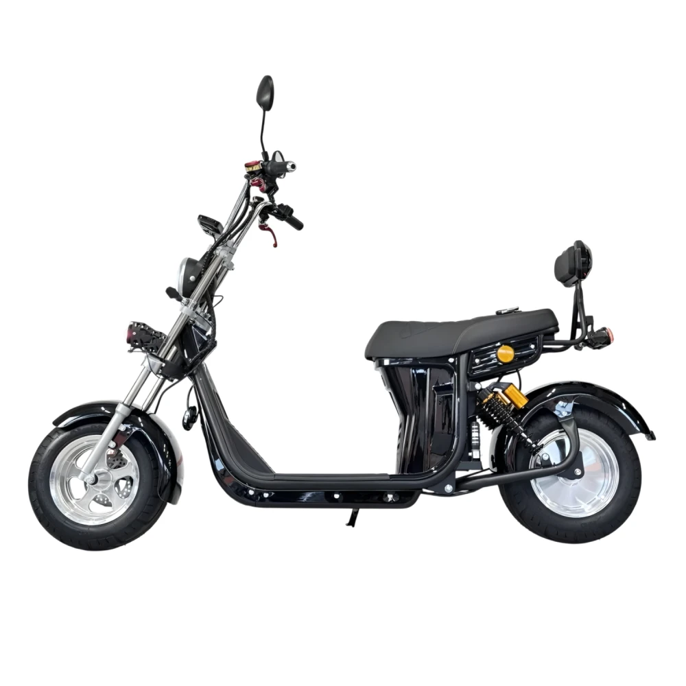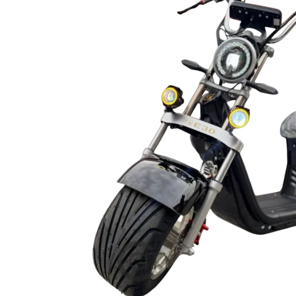 Электроскутер Citycoco GT E30 в черном глянцевом цвете — это универсальное средство передвижения. С мощностью 3000W и задним приводом, он обеспечивает отличную динамику и маневренность на городских улицах. Благодаря двухколесной конструкции и надувным колесам диаметром 18 дюймов, скутер уверенно держится на дороге, что делает его идеальным для поездок по различным покрытиям.Съемный аккумулятор с напряжением 60V позволяет преодолевать расстояние до 50 км на одном заряде, что делает его идеальным вариантом для ежедневных поездок. Время зарядки составляет всего 5 часов, что обеспечивает быструю готовность к новым приключениям. Кроме того, в конструкции предусмотрено дополнительное место под аккумулятор, что увеличивает возможности автономной работы.Скутер весит 75 кг и может выдерживать максимальную нагрузку до 200 кг, что делает его подходящим для различных пользователей. Дисковые гидравлические тормоза обеспечивают надежную остановку, а большое мягкое сиденье и амортизаторы гарантируют комфорт даже при длительных поездках.Дополнительно, Citycoco GT E30 оснащен бортовым компьютером, зеркалами, звуковым сигналом, фарой и поворотниками, что повышает безопасность и удобство. Большая дека под ноги и прочная конструкция делают поездки еще более приятными.Электроскутер Citycoco GT E30 — это идеальное сочетание стиля, мощности и комфорта для тех, кто ценит удобство и скорость в городской среде.