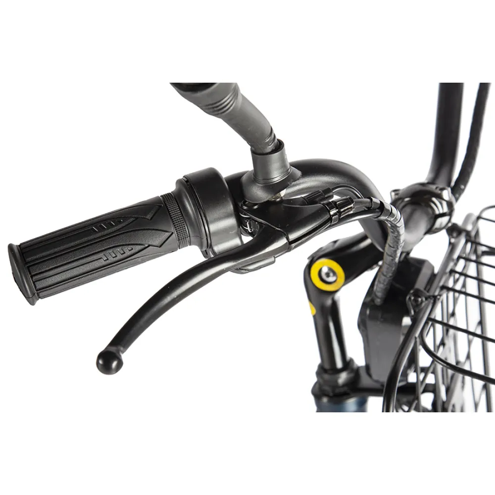 Велогибрид имеет устойчивые колеса диаметром 20 дюймов, достигает скорости в 35 км/час, выдерживает нагрузку в 120 кг. Выполнен в красивом темно-синем цвете.