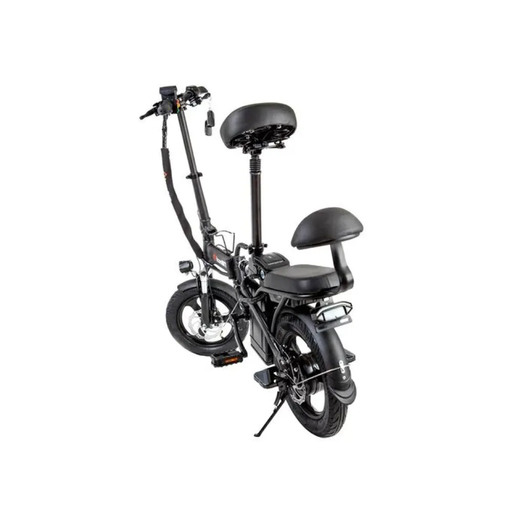 Модель относится к категории складных, удобная при транспортировке. Технически – надежна, комфортная, безопасная и долговечная. Электровелосипед изготовлен из ударопрочного материала, не теряющего первоначальных характеристик при случайном падении. Техника оснащена амортизационной вилкой с амортизатором, брендовой тормозной системой и накатистыми колесами. В совокупности запчасти с основными элементами качественную езду, в которой возможно преодоление небольших препятствия